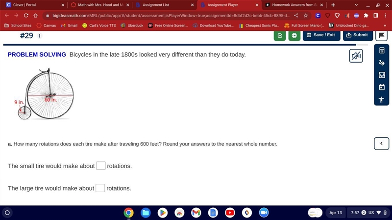 PROBLEM SOLVING Bicycles in the late 1800s looked very different than they do today. a. How many rotations does each tire make after traveling 600 feet? Round your answers to the nearest whole number.
