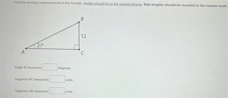 since the measures of ∠A and ∠C are given, we add 90 (∠C) to 27 (∠A) and x (∠B) which equals 180 by triangle angle sum theorem.
