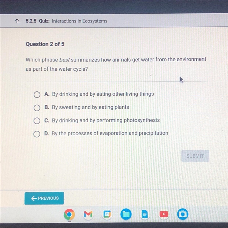 D is not correct because though animals can get water from their environment when it rains (through drinking) evaporation is the removal of water.