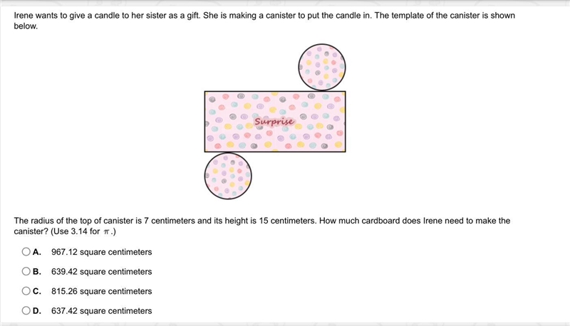 The exact surface area is 203π square cm., or about 637.74 square cm.