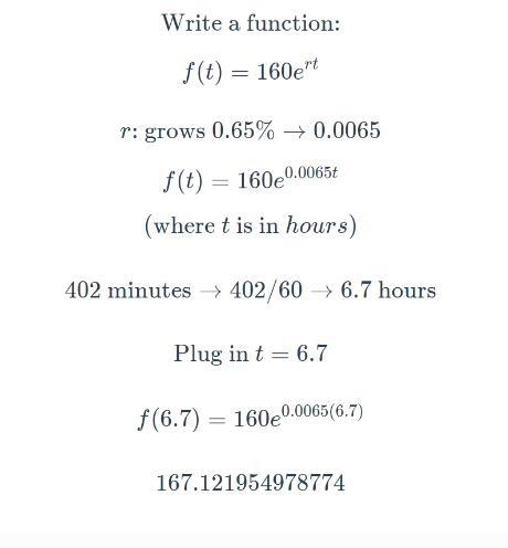 A quantity with an initial value of 160 grows continuously at a rate of 0.65% per hour. What is the value of the quantity after 402 minutes, to the nearest hundredth?