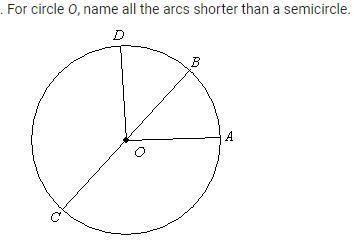 For circle O, name all the arcs shorter than a semicircle. A. DBA, DB, DAC, AC, AB B. BDC, DB, DC, AC, AB, BAC C. DBA, DB, DC, AC, AB D. DB, DC, AC, AB
