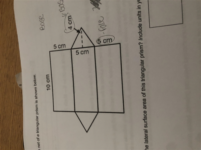 First, we need to identify the shape of the bases of the prism. The net shows that the bases are triangles. Second, we need to find the area of one of the triangles. We can use the formula for the area of a triangle: A = 1/2 x base x height. The base is 5 cm and the height is 4 cm, so the area is 1/2 x 5 cm x 4 cm = 10 cm^2. Third, we need to find the perimeter of one of the triangles. We can use the Pythagorean theorem to find the length of the hypotenuse: c^2=a^2+b^2, where a = 4 cm and b = 3 cm (from the net). So, c^2 = 4^2+3^2=16+9=25, and c = 5 cm.