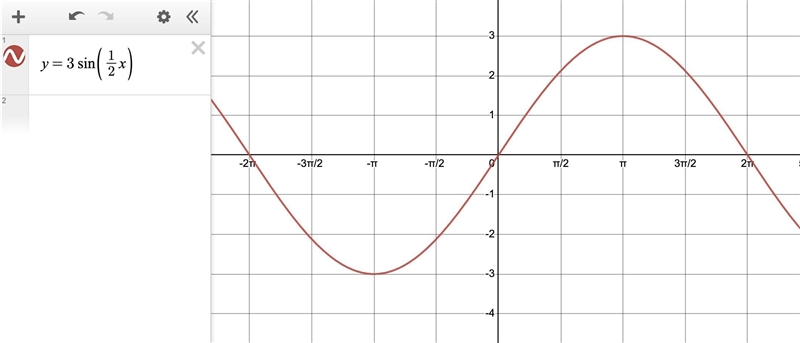 That one cycle extends from x = -2π to x = 2π, a total of 2π -(-2π) = 4π units. The period of the parent sine function y=sin(x) is 2π, so this represents a horizontal expansion by a factor of 2. That scaling is represented in the function's equation as a divisor of x: