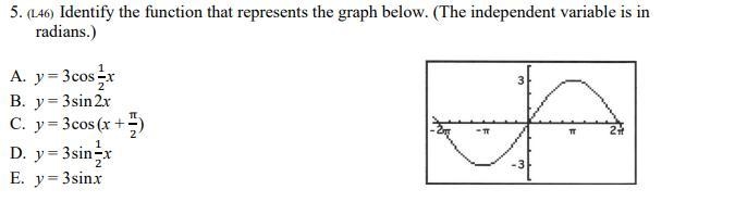 The graph shows one cycle of a sine function. It has a peak value of 3, indicating a vertical scaling by a factor of 3. All of the answer choices have this scale factor:
