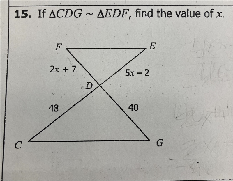 48(2x+7)=40(5x-2) (if you see it you can reduce numbers so its not so big but i won't to keep things simple)