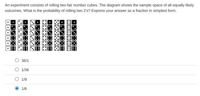 Therefore, the probability would be 1 [outcome]/36 [total outcomes], which cannot be simplified any further.