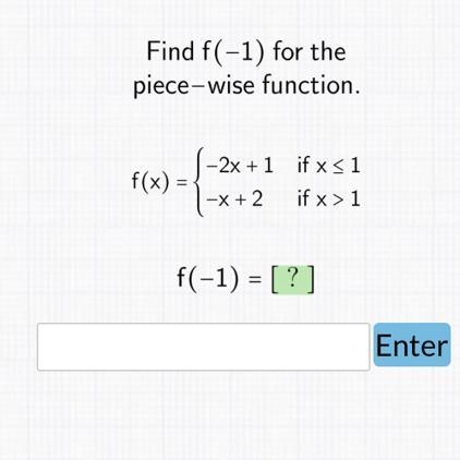 well, for the piece-wise function, we know that hmmm x = -1, -1 is less 1, so the subfunction that'd apply to that will be -2x + 1, because on that section "x is less than or equals to 1".