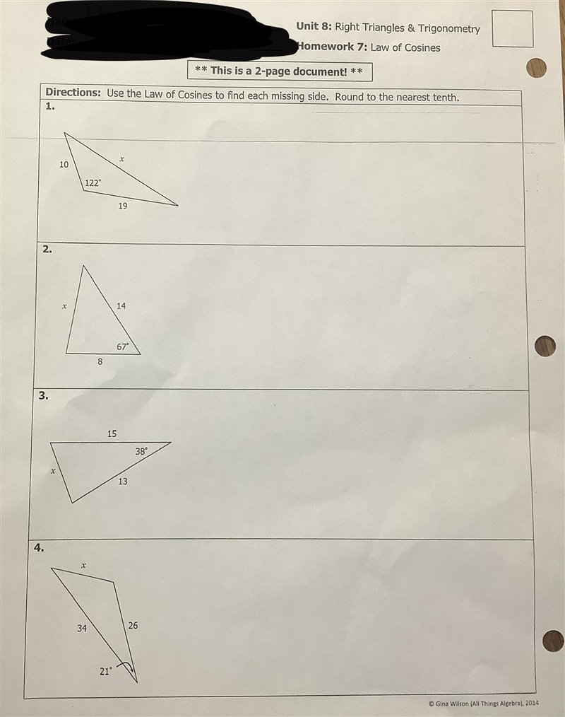 4. Solution: C=(A^2 + B^2 - 2 ab cosy) = C= (34^2 + 26^2 - 2 * 34 * 26 * cos (21 degrees) = 13.46959 rounded to the nearest 10 is 13.47
