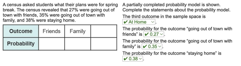 The table shows the sample space for the spring break plans of the students surveyed. The sample space includes three outcomes: going out of town with friends, going out of town with family, and staying at home. The probabilities for each outcome are given in the table. The probability of an outcome represents the proportion of students who reported that outcome in the census.