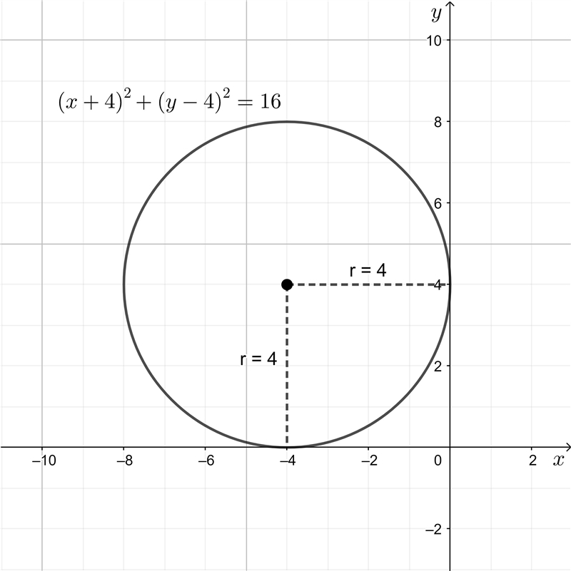 Substitute the center (-4, 4) and the radius, r = 4, into the standard equation of a circle: