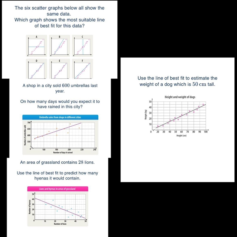 I) In the scatter graph question, D is the most suitable line of best fit for the data. Reason: the line diligently follow the points as they move upwards. Also, the points outside the line(i.e besides the line) are equally divided, on the up and down part of the line unlike in F