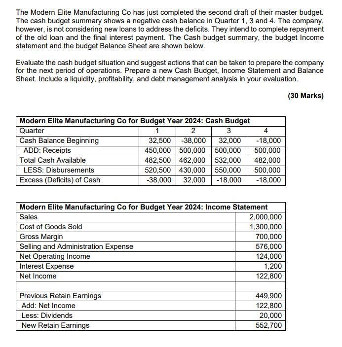 The cash budget summary for Modern Elite Manufacturing Co shows negative cash balances in Quarters 1, 3 and 4, which indicates that the company may have cash flow problems. The negative cash balances are a result of the company's high disbursements, which outweigh their receipts. Rapidly growing companies with significant inventory requirements will encounter tight cash flow situations when they are expanding operations. Because Modern Elite is expanding its operations, it is undergoing such a scenario.