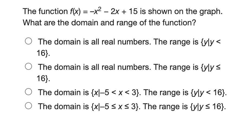 The vertex of the solid-line open-down parabola is at (-1, 16), therefore the range is y≤16 (maximum value of y is 16, at the vertex point (-1, 16). Range is y