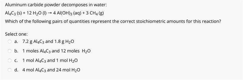 Aluminum carbide powder decomposes in water: Al4C3 (s) + 12 H2O (l) → 4 Al(OH)3 (aq-example-1
