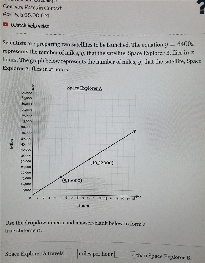 Space explorer A flies at a rate of (32000-16000)/(10-5) = 3200 miles per hour. Slope is (y2 - y1) / (x2 - x1) where the coordinates are (x1,y1) and (x2,y2).