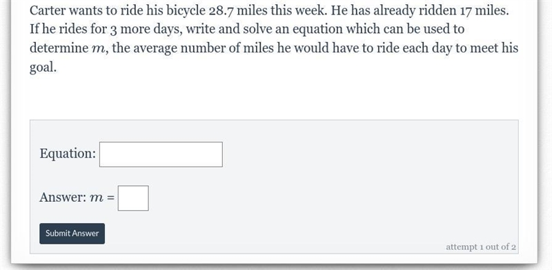 You want an equation and its solution to help you find the number of miles Carter must ride his bicycle each day (m) to total 28.7 miles after 3 more days, given he has already ridden 17 miles this week.