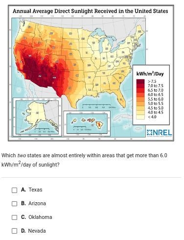 Which two states contain large areas that get more than 7.5 kWh/m2/day of sunlight? I A. California (CA) B. Georgia (GA) I C. Florida (FL) D. Arizona (AZ)