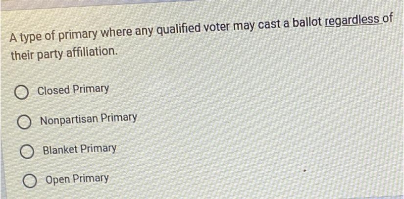 The answer should be open primary, because the definition of an open primary is a primary election that does not require voters to affiliated with a political party to vote for partisan candidates.