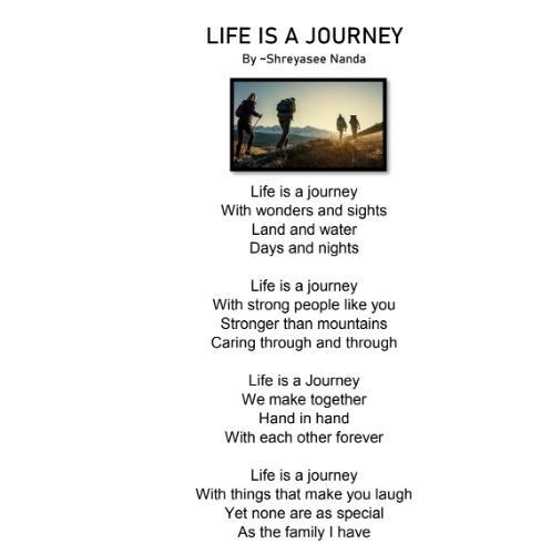 3. The title "Life is a Journey" is a metaphor that reflects the overall theme of the poem, which is about the ups and downs of life, the importance of companionship and family, and the appreciation of life's wonders.
