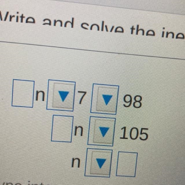 Seven less than the product of a number n and 7 is no more than 98.