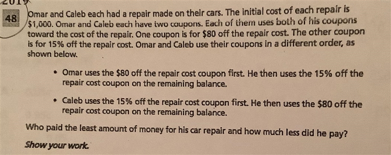Case 2: Caleb uses the 15% off the repair cost coupon first. He then uses the $80 off the repair cost coupon on the remaining balance.