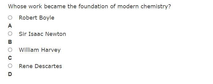 Whose work became the foundation of modern chemistry? ARobert Boyle BSir Isaac Newton CWilliam Harvey DRene Descartes