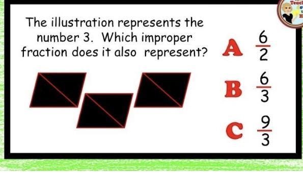 The illustration represents the number 3. Which improper fraction does it also represent?