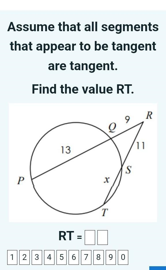 Assume that all segments that appear to be tangent are tangent. Find the value RT. P 13 RT = Q X T 9 S R 11​