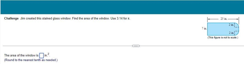 Step-by-step explanation: Each round part is 1/4 of a circle. First we get the radius of the circle which is 2. Then we find the area so it is 3.14 * 2^2 = 3.14 * 4. That is 12.56. Then, because it is 1/4 of a circle you do 1/4 * 12.56 which is 3.14. There are two of those round parts so 3.14 * 2 = 6.28. The square in between them is 2*2 = 4. Then we find the width which will be 25in - 2in = 23in. 23 * 7 = 161. 161 + 4 + 6.28 = 171.28. Then we round so it is 171.3.