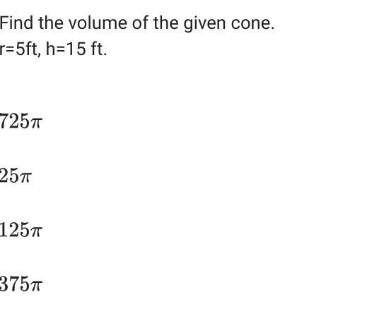 Find the volume of the given cone. r=5ft, h=15 ft.