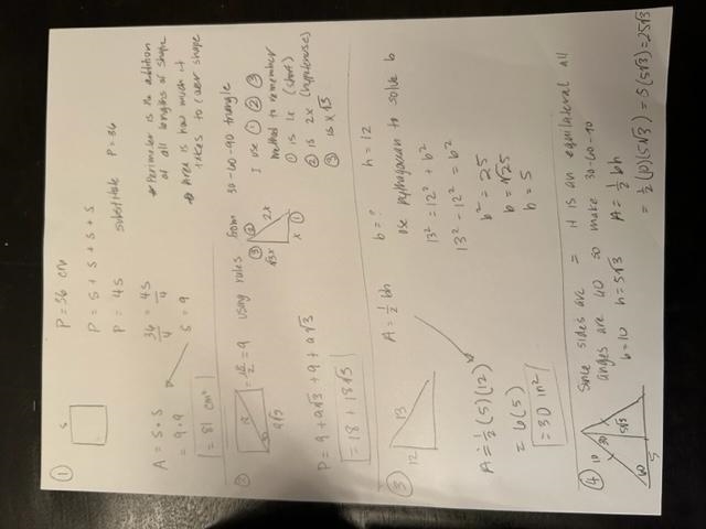 1. Because a square has 4 equal sides, you can find the side length using the perimeter by doing 36/4=9cm