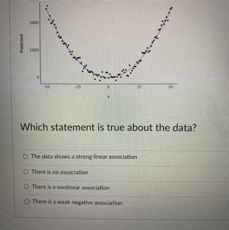 Look at the scatter plot below. Which statement is true about data? A The data shows a strong linear association B There is no association C There is a nonlinear association D T…