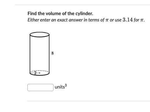 = pi 2^2 * 8 = 32 pi units^3 <====exact answer
