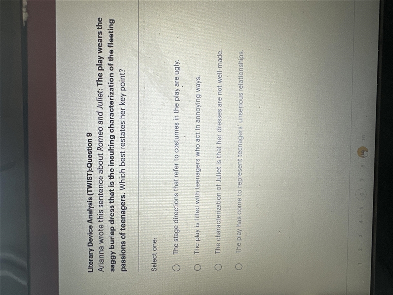 The original sentence compares the play to a saggy burlap dress, which is a metaphor. The metaphor implies that the characterization of the fleeting passions of teenagers in the play is unflattering and unattractive. Option D restates the key point by directly stating that the play has come to represent teenagers' unserious relationships, which is in line with the original sentence's metaphorical comparison. Options A, B, and C do not accurately restate the key point made in the original sentence.