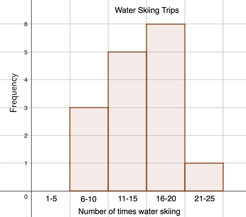 A histogram titled Water Skiing Trips. The x-axis is labeled Number of Times Water Skiing and has intervals of 1 to 5, 6 to 10, 11 to 15, 16 to 20, and 21 to 25. The y-axis is labeled Frequency and starts at 0 with tick marks every 1 units up to 6. There is a shaded bar for 6 to 10 that stops at 3, for 11 to 15 that stops at 5, for 16 to 20 that stops at 6, and for 21 to 25 that stops at 1. There is no shaded bar for the 1 to 5 interval.