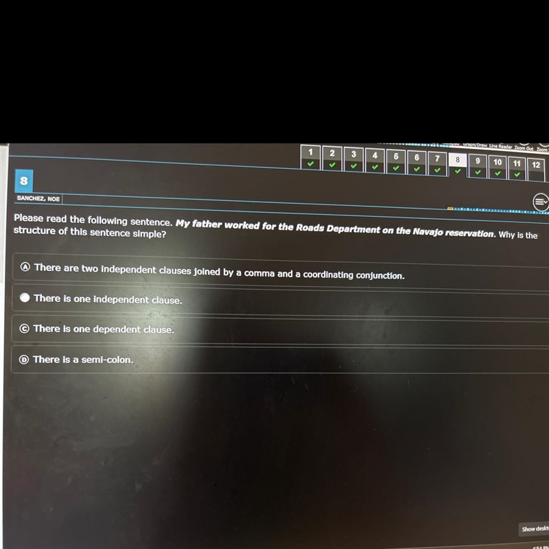 The structure of the sentence "My father worked for the Roads Department on the Navajo reservation" is simple because it contains only one independent clause. There are no dependent clauses, semi-colons, or coordinating conjunctions used to join independent clauses. The sentence expresses a complete thought and can stand alone as a grammatically correct statement.
