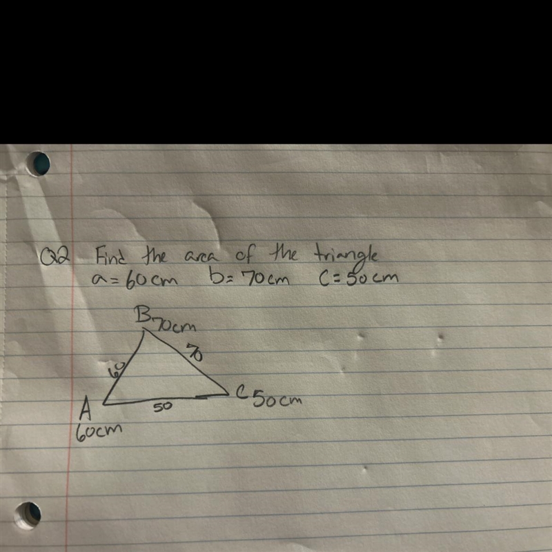 Find the area of the triangle. a=60cm b= 70 cm C= 50 cm-example-1