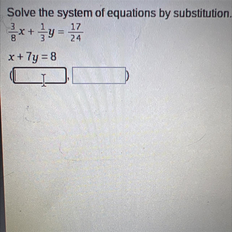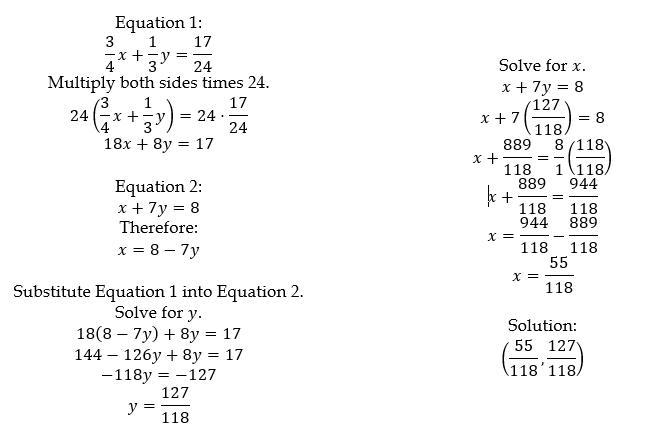 Solve the system of equations by substitution 3/4x + 1/3y = 17/24 x + 7y = 8