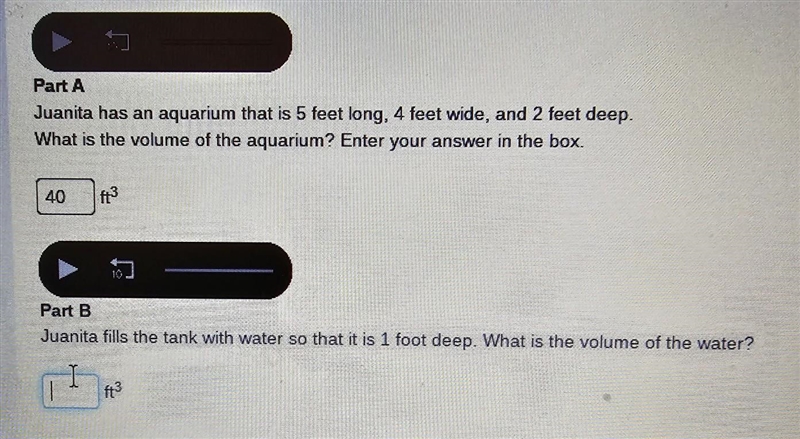 because Juanita has a aquarium that is 5 feet LONG, 4 feet WIDE, and 2 feet DEEP, in part b it asks what if the water is 1 foot DEEP so what they're trying to say is what if you replace the original 2 feet DEEP with 1 foot DEEP?