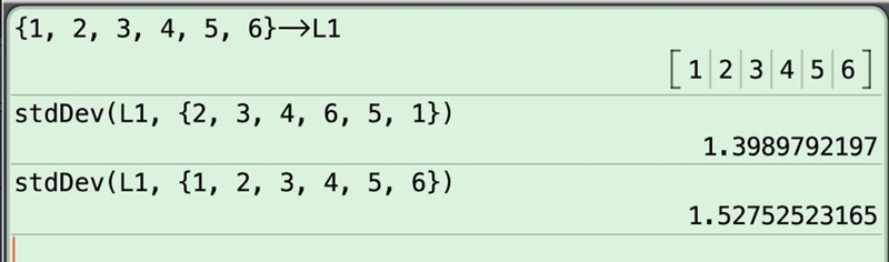 In the computation, the first list (L1) is the set of data values. The second list, {2, 3, 4, ...} for example, is their relative frequencies—the heights of the bars in the histogram.