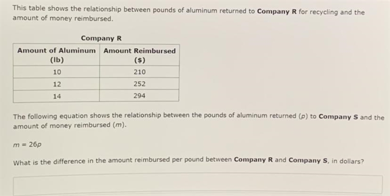 Company R is getting 21 dollars for every 1 pound (p) of aluminium. Company S is getting 26 dollars for every 1 pound of aluminium. The Equation for Company R is m=21p whilst the equation for Company S is m=26p. 26 - 21 = 5. Therefore the difference is m=5p.