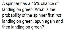 To find the probability of both events we would have to do 0.55*0.45=0.2475. Therefore the probability of the spinner first not landing on green, spun again and then landing on green is 0.2475 or 24.75%