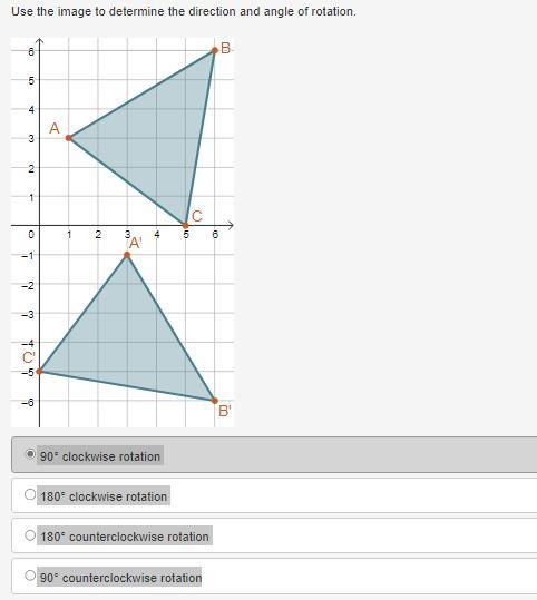 HELP ASAP I NEED THIS Use the image to determine the direction and angle of rotation. 90° clockwise rotation 180° clockwise rotation 180° counterclockwise rotation 90° countercl…