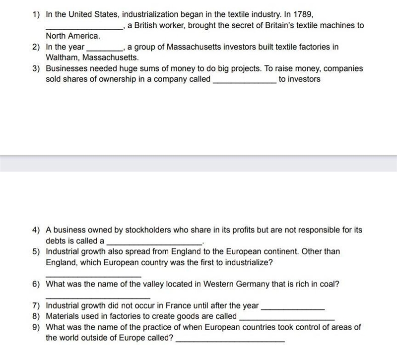 1) In the United States, industrialization began in the textile industry. In 1789, Samuel Slater, a British worker, bought the secret of Britain's textile machines to North America.