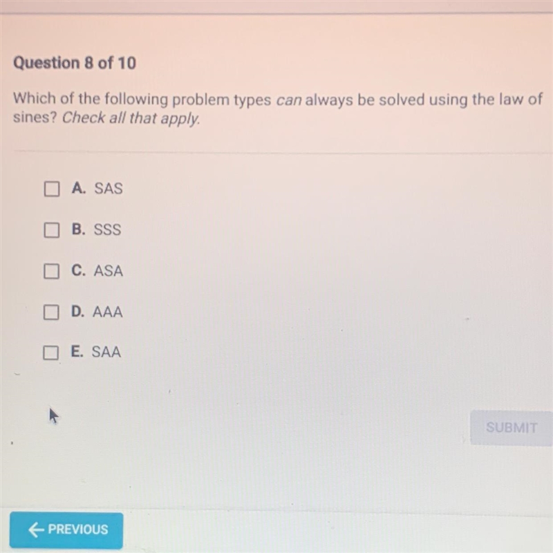 for SSS (all 3 sides are known) we need the law of cosine to solve the angles (at least one of them, and then we could continue with either law).