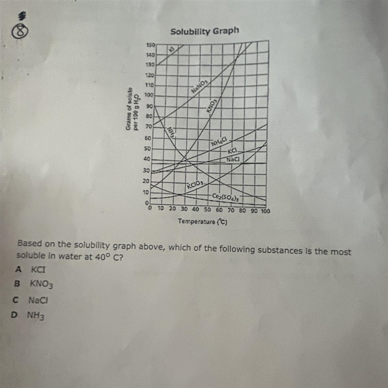 Based on the solubility graph above, which of the following substances is the most soluble in water at 40^degree C