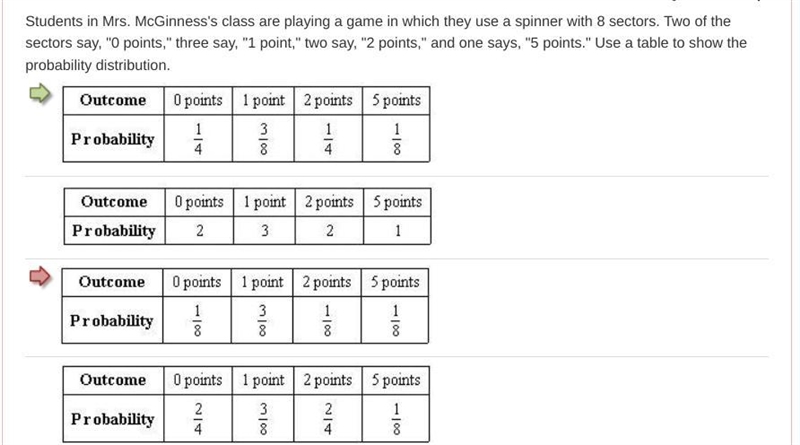 Students in Mrs. McGinness's class are playing a game in which they use a spinner with 8 sectors. Two of the sectors say, "0 points," three say, "1 point," two say, "2 points," and one says, "5 points." Use a table to show the probability distribution.