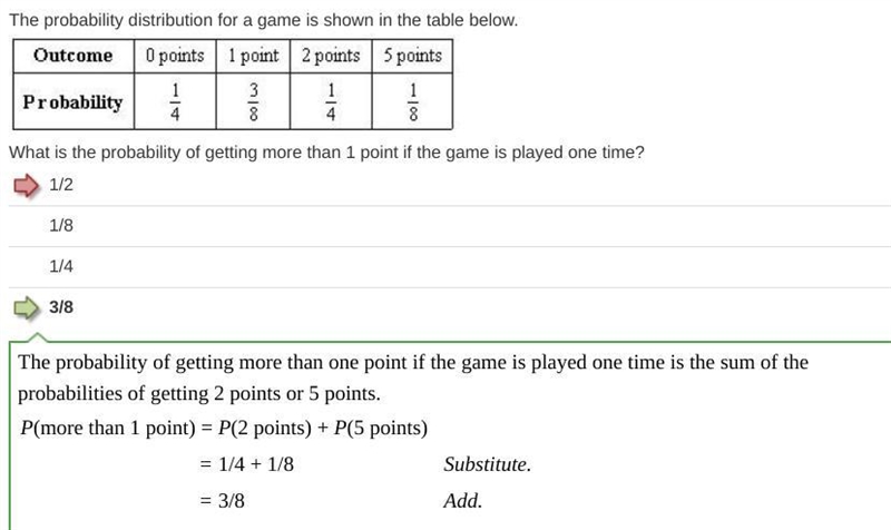 The probability distribution for a game is shown in the table below. What is the probability of getting more than 1 point if the game is played one time?