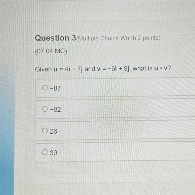 Given u = 4i - 7j and v = -6i + 9j, what is u • v? -87 -82 26 39